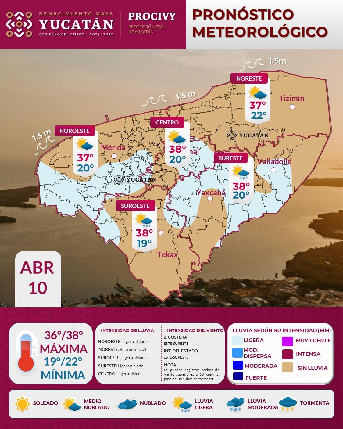 Para este viernes 10 de abril, el ingreso de aire marítimo proveniente del Mar Caribe determinará las condiciones climáticas en la región. Se espera un ambiente muy caluroso durante el día, aunque la entrada de humedad combinada con el calentamiento diurno podría generar lluvias ligeras y dispersas en algunos puntos del estado.