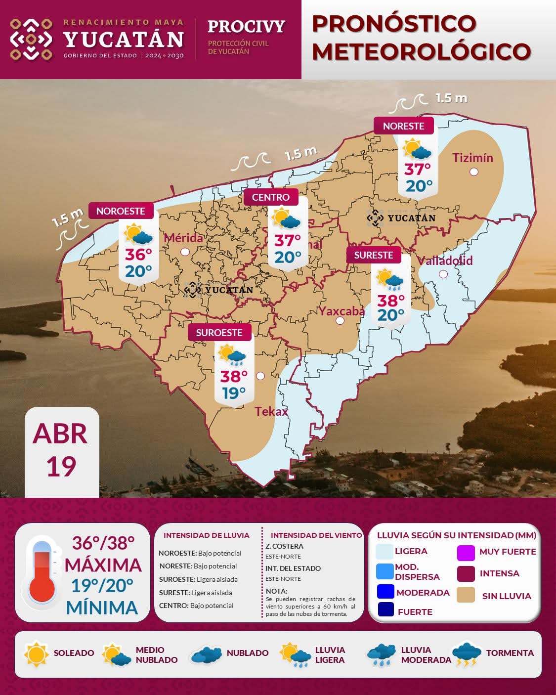 ¡Feliz domingo! Para hoy 19 de abril, el ingreso de aire marítimo desde el Mar Caribe y el Golfo de México nos regalará un día bastante caluroso en todo Yucatán. En el interior del estado, prepárate para temperaturas máximas de 36 a 38°C, mientras que en la costa el ambiente será más fresco, oscilando entre los 27 y 29°C.