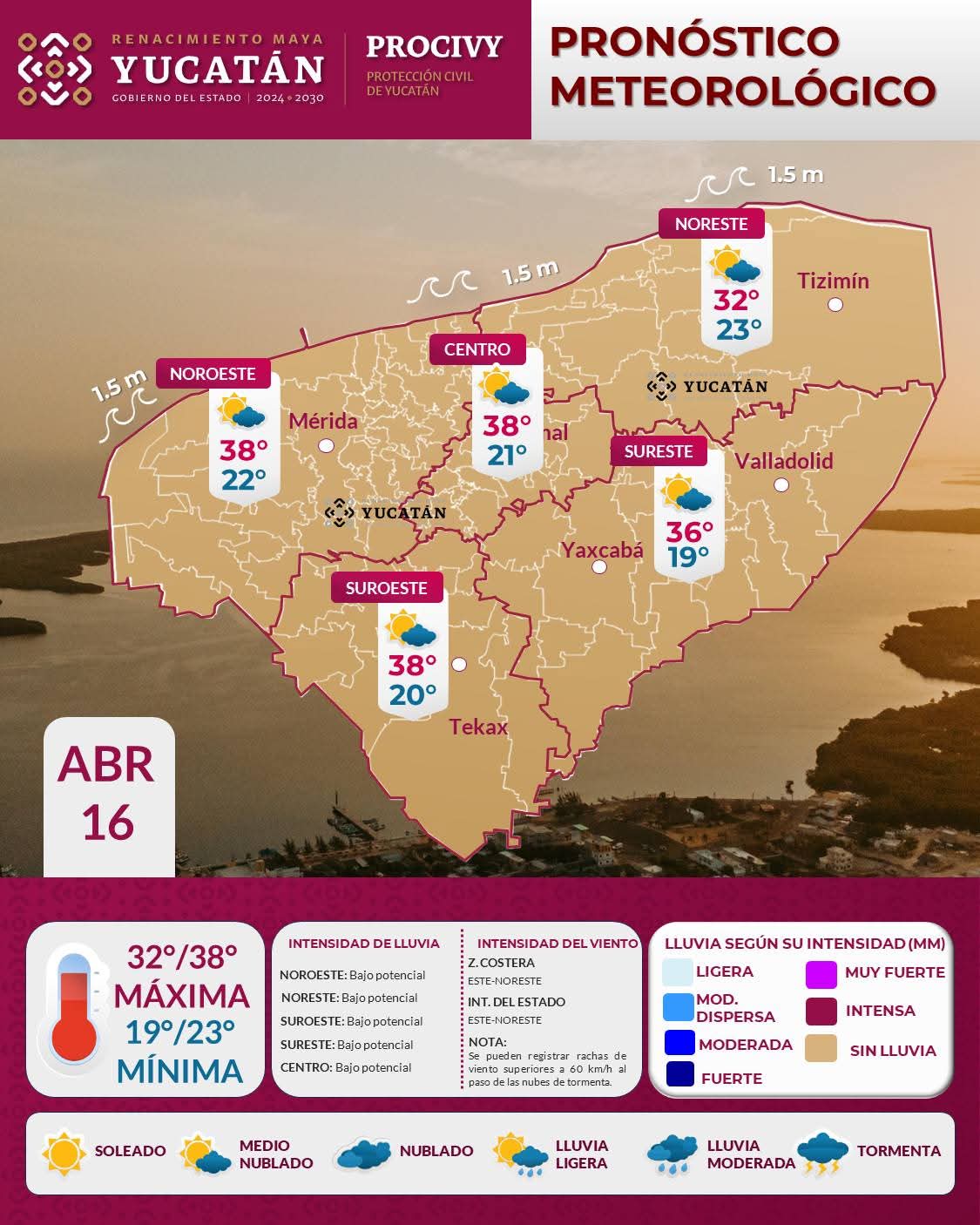 Para este jueves 16 de abril, el estado de Yucatán se prepara para una jornada de cielos despejados y mucha luz. Un sistema de Alta Presión, ubicado estratégicamente en el noreste del Golfo de México, será el protagonista principal, garantizando condiciones de tiempo estable y muy pocas nubes en la mayor parte del territorio estatal.
