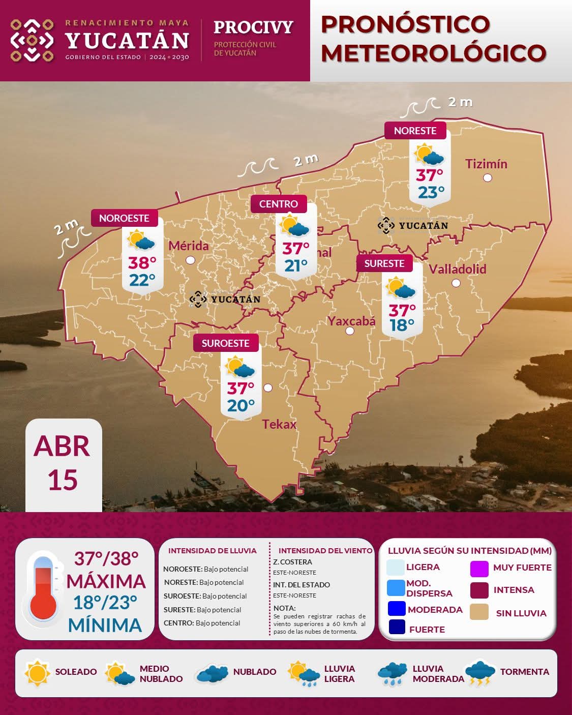Si estás en el área de Umán o Maxcanú, prepárate para los 38°C. El viento estará soplando del este por la mañana, pero por la tarde girará al noreste con rachas que pueden alcanzar los 60 km/h en la costa. ¡Cuidado con las gorras voladoras!