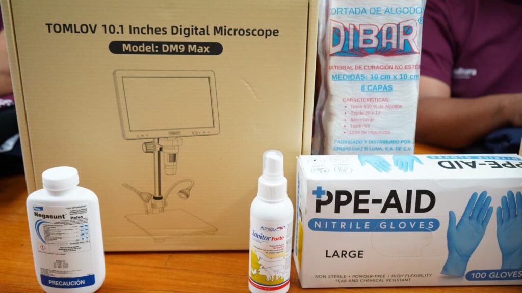 El apoyo fue destinado a las y los 15 especialistas que participan en este plan, quienes recibieron guantes, gasas, Negasunt, desparasitantes, computadoras, impresoras, uniformes, microscopios, ivermectina, deltametrina y kits para toma de muestras, herramientas necesarias para reforzar su trabajo en campo y mejorar la respuesta ante los casos detectados.